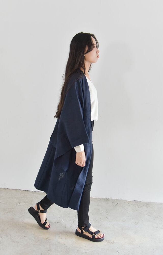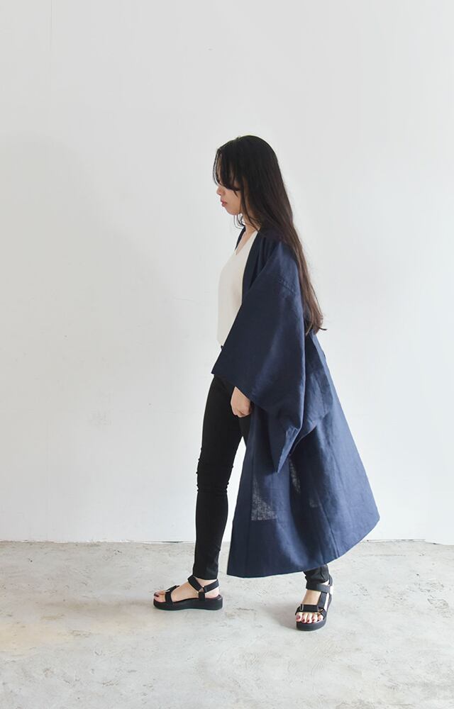 日本の伝統的な着物を、リネン素材で作った「長羽織」。